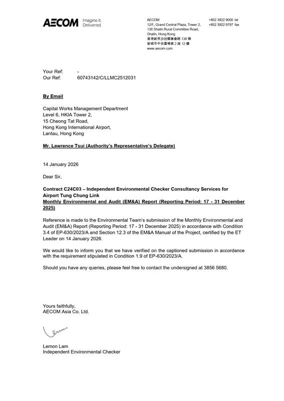 The construction works of the Airport Tung Chung Link (“ATCL”) Project commenced on 17 December 2025; therefore, the construction phase EM&A programme of the ATCL Project started on 17 December 2025. During the reporting period, no marine works in relation to the marine viaduct was undertaken thus no water quality monitoring was conducted. The ET of the ATCL Project has undertaken environmental site inspections and environmental monitoring under the construction phase EM&A programme during the reporting period.